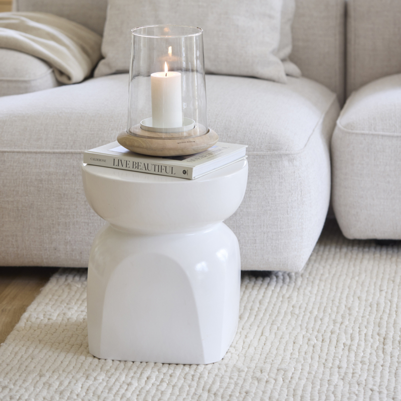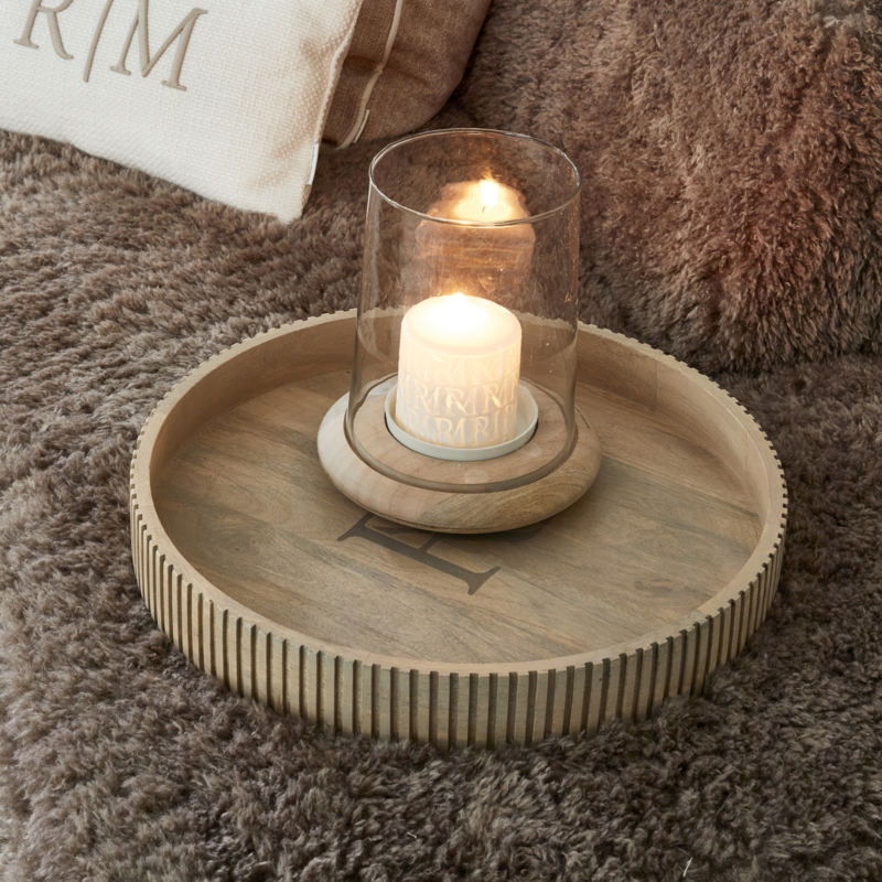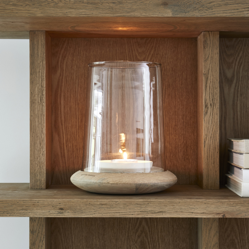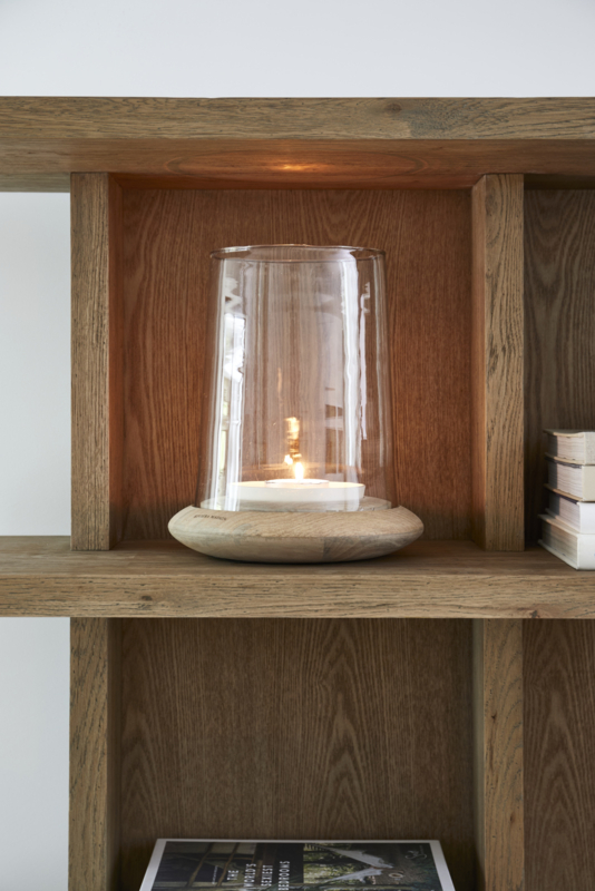 Dit fraaie windlicht, geplaatst op een elegante mangohouten voet, is een echte blikvanger in elke ruimte. De grote glazen koker omhult een sfeervolle stompkaars en zorgt voor een warme, uitnodigende ambiance.